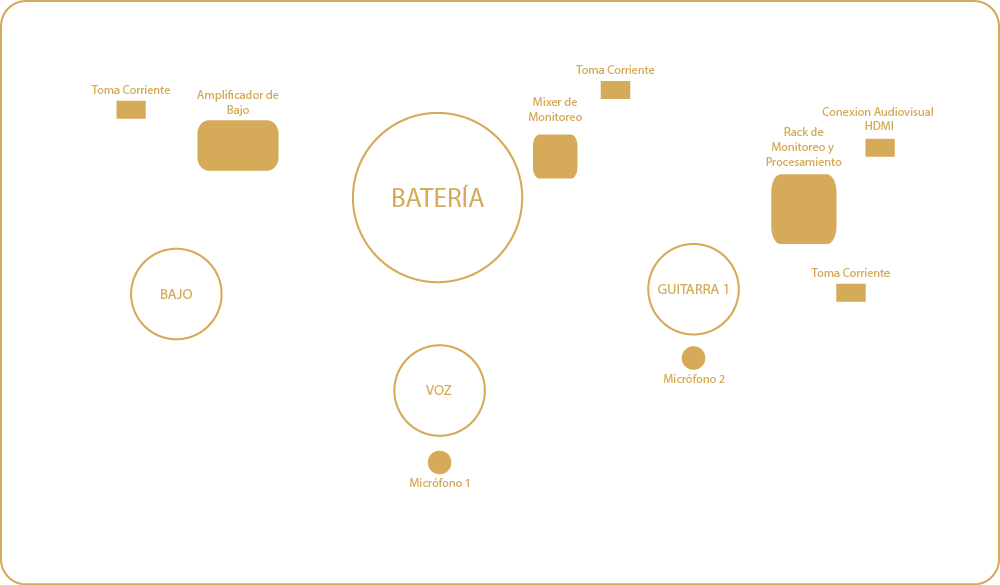 La formación de la banda cuenta con 4 miembros, 1 guitarras, 1 bajo, 1 vocalista y 1 baterista (zurdo) que es un dato que nos gusta enfatizar, ya que esto implica modificaciones en el backline, como posicionamiento de retornos y los cambios en la microfónia de la batería.
